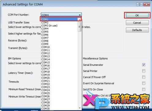 5、单击“COM Port Number”右侧的下拉箭头,选择所需要的端口号,如COM1,单击“OK”。如图:
