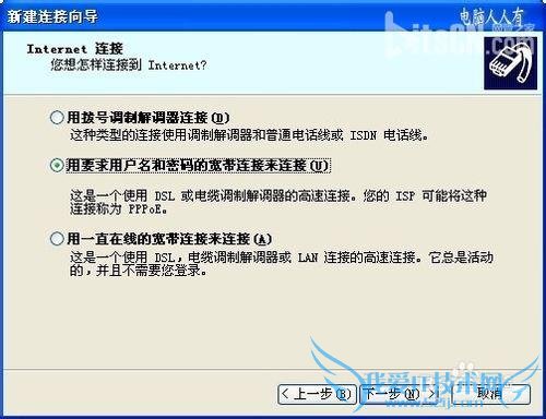 进入到这一步,就需要对自己的上网方式有一定的了解,比如最老的拨号调制解调器选择第一项,而ADSL等要求用户输入账户、密码的上网方式就需要点选第二项,一直在线的网络(无需拨号登录)点选第三项→下一步