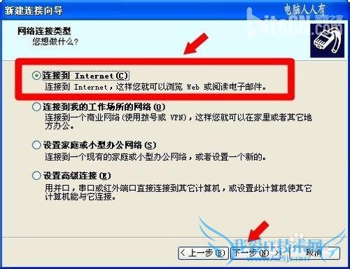 新建连接向导→连接到Internet→下一步
