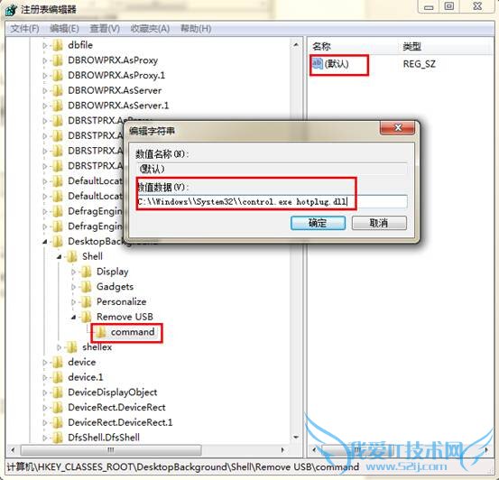 6. 接着在左侧Remove USB设置中再次点击右键,选择“新建→项”创建新键,将其命令为command。接着双击command右侧窗口中的“默认”键值,在数值数据中输入C:WindowsSystem32control.exe hotplug.dll点击“确定”即可。如下图所示