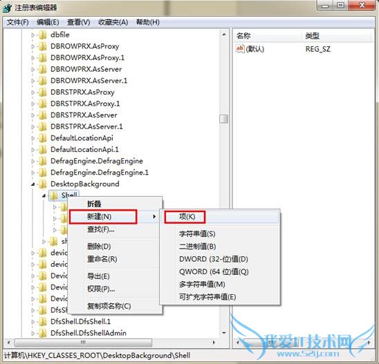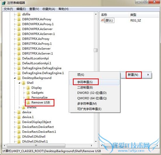 3.点击右键Shell项,选择新建(N ) - 项(K),然后新一个项,把新建的项重命名为“Remove USB”进入下一步操作。如下图所示