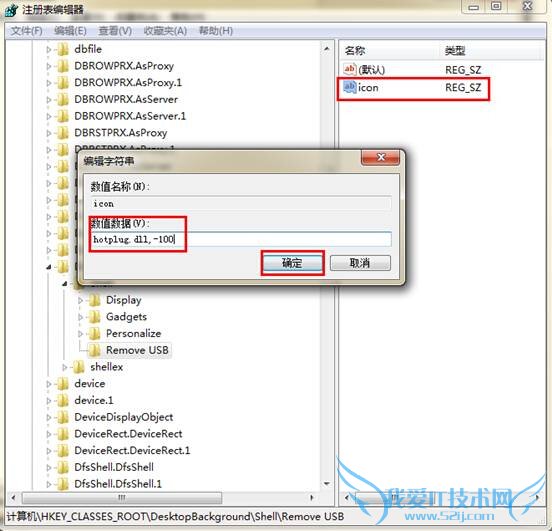 5.双击打开Icon,点击修改Icon字符串的数值数据为hotplug.dll,-100,点击确定完成设置。如下图所示