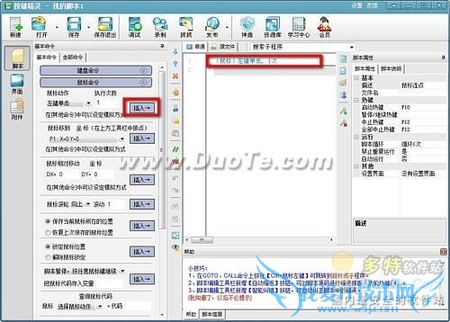 在该栏点击插入,我们会看到脚本编辑区里有了“(鼠标)左键单击”文字内容。如下图: