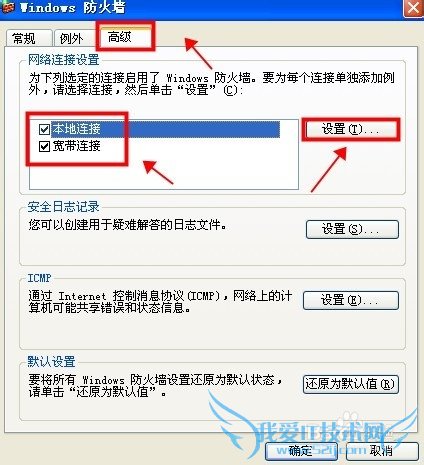 进入“Windws 防火墙”设置页面——点击“高级”——把“本地连接”和“宽带连接”前面的勾选去掉,还可以点击“设置”进入进一步设置界面。