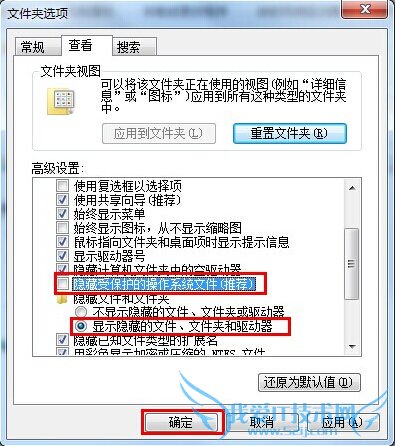 接着将电脑上的“隐藏受保护的操作系统文件( 推荐 )”前面的勾取消,然后再将”显示隐藏的文件、文件夹和驱动器“勾上即可。如下图所示