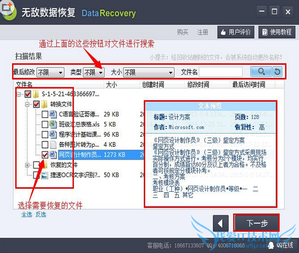 第四步:在扫描结果中,用户可以通过浏览窗口浏览文件内容来判断是否是需要恢复的文件,选择需要恢复的文件,然后点击下一步。