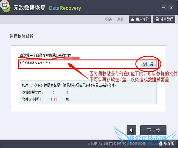 第五步:选择恢复文件存储路径,这里文件不能存储在C盘,以免造成数据恢复不完全。存放路径设置好后点击下一步。