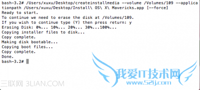 6. 敲入命令 :/Users/xuxu/Desktop/createinstallmedia --volume /Volumes/109 --applicationpath /Users/xuxu/Desktop/Install OS X Mavericks.app [--force]