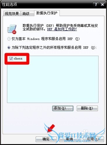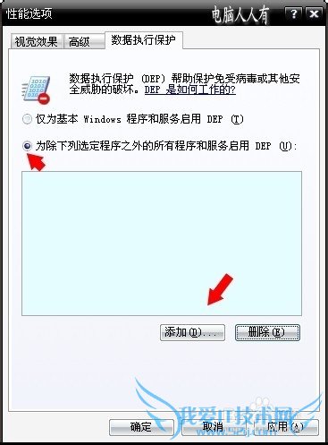 6、性能选项→数据执行保护→为除下列选定程序之外的所有程序和服务启用DEP→添加