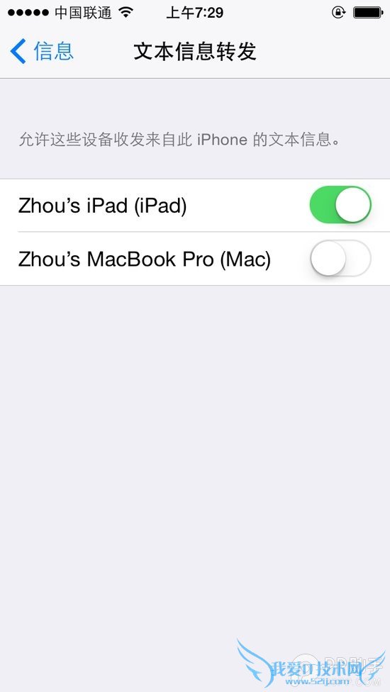 最后回到你的iPhone,进入“设置”—“信息”—“文本信息转发”, 下面会列出开启了iMessage功能并和这台iPhone的Apple ID相同的设备,在这里你可以选择开启指定设备的短信转发功能。如果设置成功,iPhone上将会显示一条确认信息。