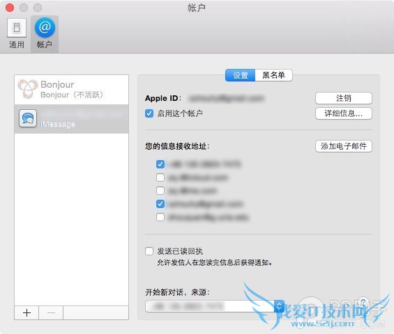打开“信息”后,点击屏幕左上角的“信息”,继续点击“偏好设置...”,确认Apple ID和iPhone中“发送与接受”的Apple ID一致。如果不一致,请选择注销,然后登陆iPhone“发送与接收”中使用的Apple ID。之后确认勾选“启用这个账户”。最后在“您的信息接受地址:”中至少选中你的手机号码和Apple ID使用的邮箱。