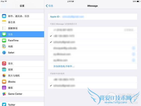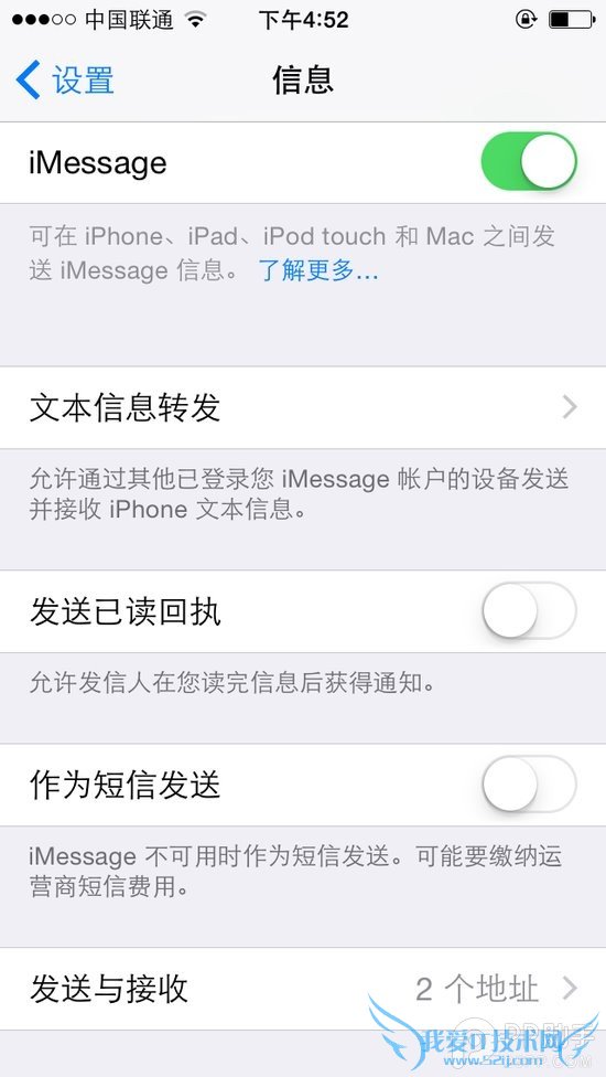 要解决这个问题很简单,比如你不想在iPad或者是iPod touch上接收iMessage信息,进入“设置”—“信息”,直接将iMessage的开关关闭。