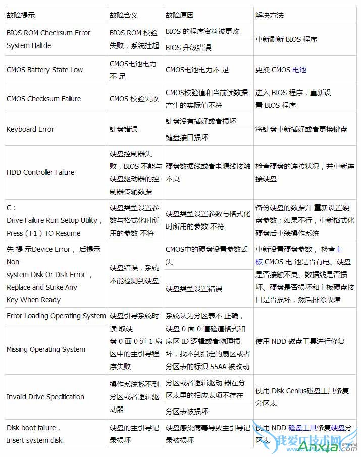 在解决开机报错故障时,可以根据显示屏上的错误提示判断故障原因,再使用相应的方法排除故障。下表为故障提示与解决方法的对照表。