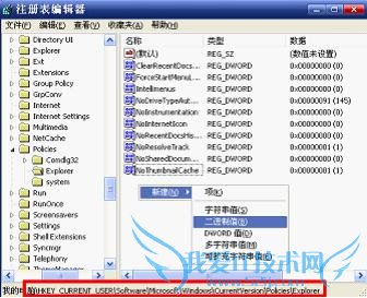 点击开始,在运行栏输入regedit打开注册表编辑器,依次打开HKEY_CURRENT_USERSoftwareMicrosoftWindowsCurrentVersionPoliciesExplorer项目,在右边的窗口右键单击选择新建“二进制值”(图1),命名为“NoDrives”。