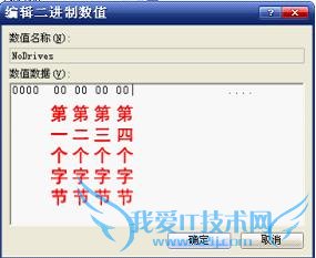 接着双击NoDrives,进入编辑二进制,可以输入8个数字(图2),第1个字节代表A~H 8个盘符,第2个字节代表I~P 8个盘符,第3个字节代表Q~X 8个盘符,第4个字节代表Y~Z 8个盘符。