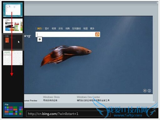 2、向上拉动Win8启动画面 进入登录界面,将鼠标移动到Win8界面左上角,Win8左上角会出现当前运行的上一个程序的略缩窗口,不用按鼠标键,继续往下移动,就能看到当前运行的更多程序略缩窗口;