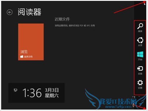5、将鼠标移动到Win8界面的右上角或者右下角,会出现Win8系统的“Charm”快捷工具栏,包含搜索、共享、开始、设备、设置等选项;