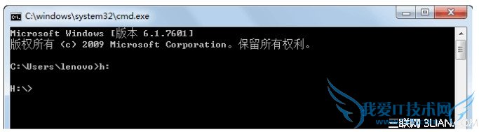 3、在DOS状态下进入可移动磁盘。先查看可移动磁盘的盘符,比如“H”盘,则输入“h:”回车,就可进入“H:>”。