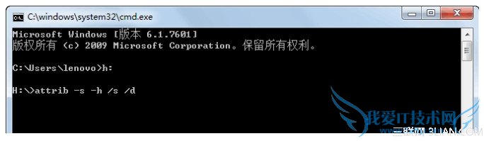 4、在移动盘符下输入“attrib –s –h /s /d”如下图,注意空格,回车。稍等片刻,当再次出现“H:>”时,再去查看移动磁盘,文件夹的隐藏属性已经去除。