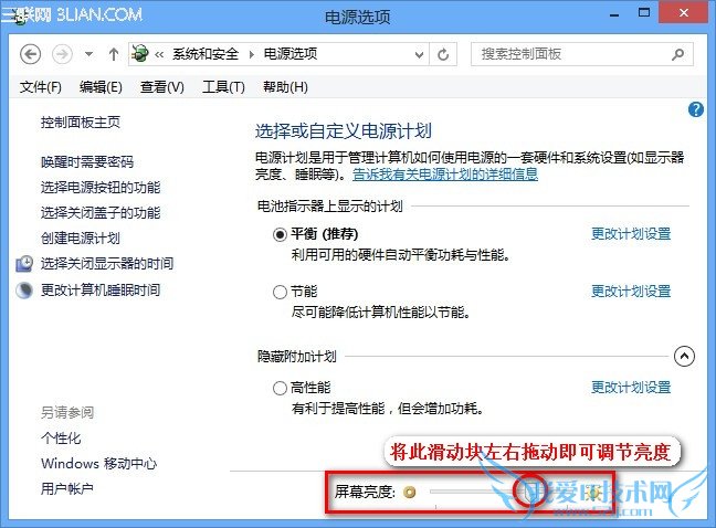 Win7或Win8系统下,打开计算机---控制面板---查看方式(大图标)---电源选项,在打开的窗口底部“屏幕亮度”可见调节滑动条,左右滑动即可调节屏幕亮度。(Win8为例):