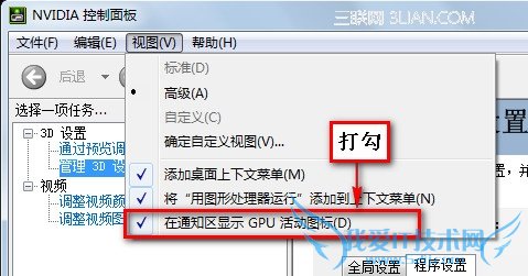 新版本驱动打开NVIDIA控制面板→视图,此处有三项可选,新增“在通知区显示GPU活动图标”,一般默认打勾。
