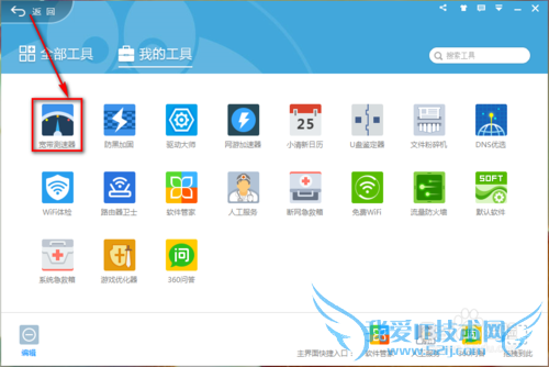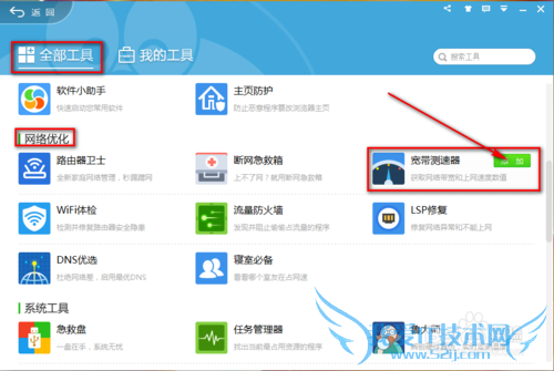 在全部工具中,找到网络优化一栏,点击添加宽带测速器。
