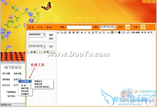 打开“在线工具”用户可进行数据备份、还原,信纸的设置等。关于鸿飞日记本信纸的设置,2345软件教程有专门的介绍,用户可搜索参考。