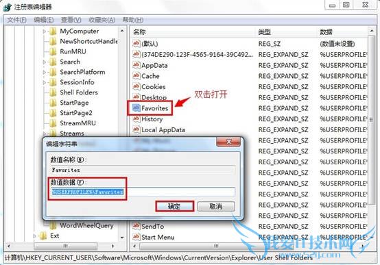 3.在右边找到Favorites项,修改数值数据为“%USERPROFILE%FAVORITES”点击确定完成操作。如下图所示