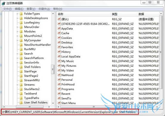 2.打开注册表编辑器,依次展开[HKEY_CURRENT_USER/Software/Microsoft/Windows/CurrentVersion/Explorer/UserShell Folders]项。如下图所示