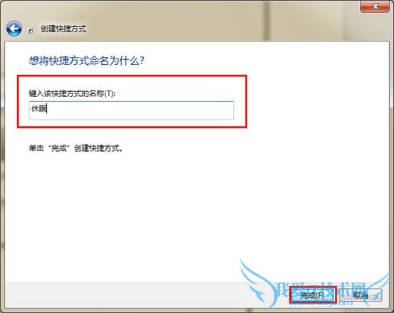 三、接着将新建的快捷方式设定一个名称,取名为“休眠”,点击完成按钮即可,如下图所示: