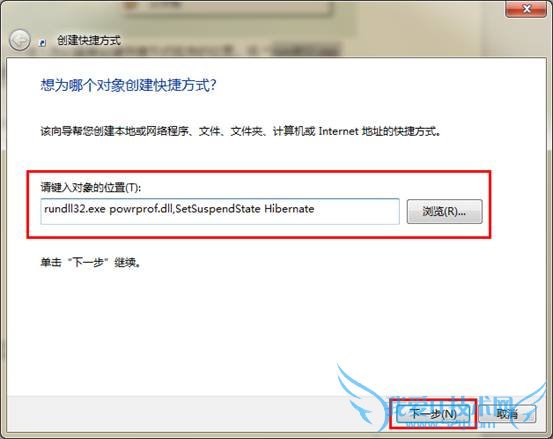 二、接着在弹出的窗口中键入我们需要创建快捷方式程序的位置,将“rundll32.exe powrprof.dll,SetSuspendState Hibernate”输入,点击下一步。如下图所示: