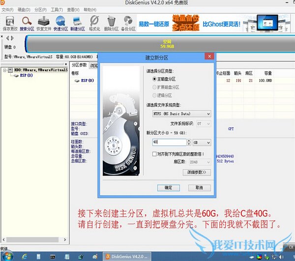 2.7、新分区大小,可根据自己需求输入你需要硬盘容量大小。一般都是50G,虚拟机测试,在测试的时候,选择硬盘容量是60G,这里就输入40G容量。