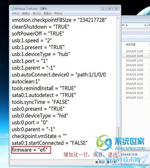 找到虚拟机windows 7 x64.vmx,记事本打开它,修改为“firmware="efi"”,保存后退出记事本