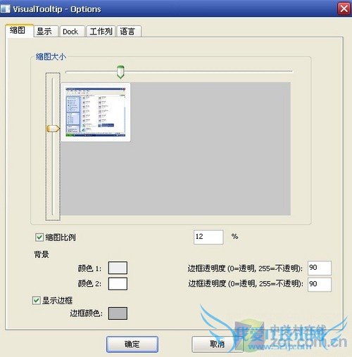 这款名为VisualTooltip的小软件,无需安装即可直接运行,首先在语言选项中,我们可以将其设置为“简体中文”状态,之后切换到到“缩图”选项卡,可以根据我们的屏幕尺寸、结合自己的实际要求,设置最为合理的缩略图尺寸信息,另外在显示选项和Dock选项中,还能够根据自己的喜好,设定各类显示效果,之后点击确定,完成设置项目的保存后,即可查看对应效果。