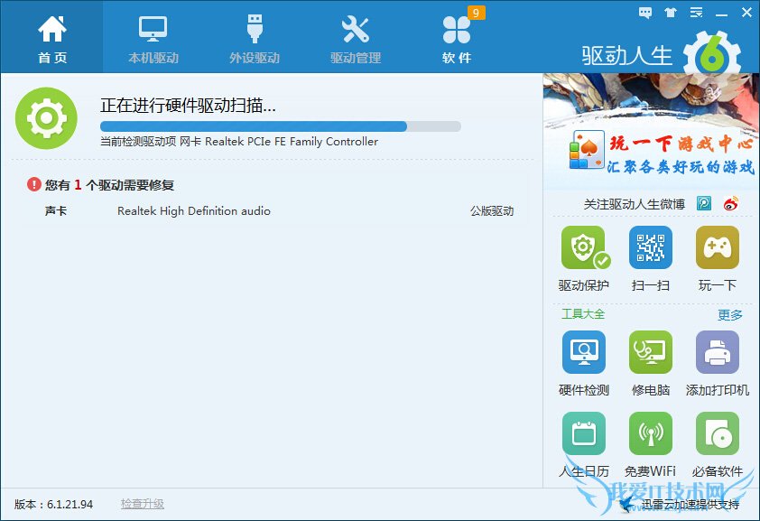 下载安装最新版驱动人生6,打开软件并点击立即检测,根据提示进行修复或重新下载安装声卡驱动即可。