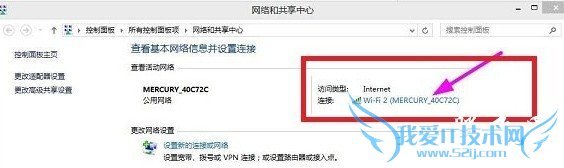 2、在网络和共享中心点击自己的无线网路连接,如下图:
