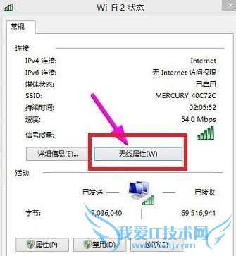 3、在弹出的wifi状态中选择无线属性,如下图: