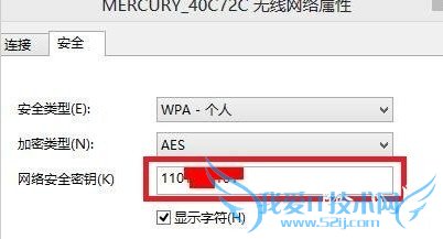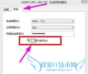 4、在弹出的无线属性中选择安全,然后把下图中显示字符前面的框点击选上 ,就可以看到无线密码了,如下图:
