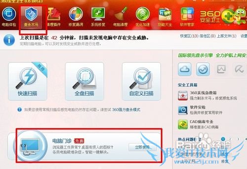 打开360安全卫士。选择查杀木马。选择电脑门诊。点击立即使用。