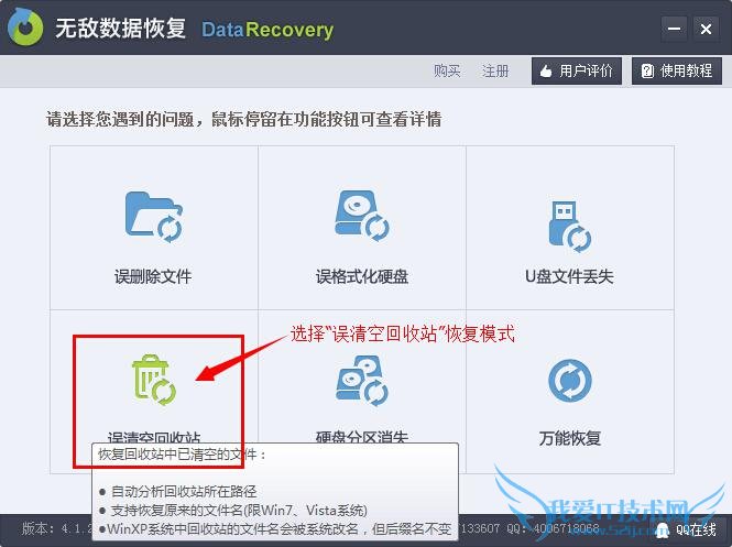 步骤3、打开无敌数据恢复软件,用户将可以看到整个软件的基本界面。选择“误清空回收站”选项进入到下一步。