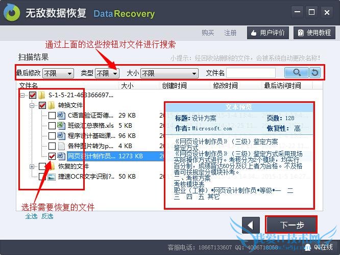 步骤5、在扫描结果中,用户可以通过浏览窗口浏览文件内容来判断是否是需要恢复的文件,选择需要恢复的文件,然后点击下一步。