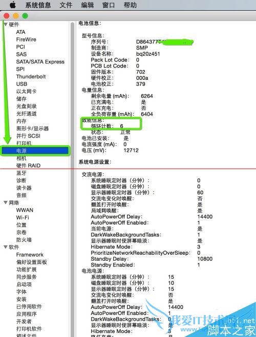 3、在硬件窗口一栏中,选择电源,右侧将会显示您目前的电池循环情况,完整的充电放电一次为一个循环周期。