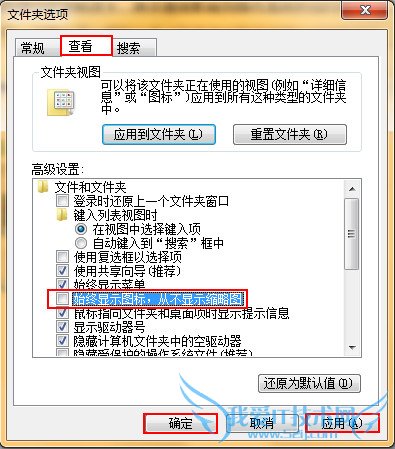 2、在文件夹选项中,选择“查看”选项卡,然后在高级设置窗口中将“始终显示图标,从不显示缩略图”选项取消勾选,接着点击“应用—确定”按钮,如下图所示: