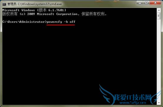 5、进入到命令提示符窗口后,输入“powercfg –h off”指令,按下回车键确认,如下图所示: