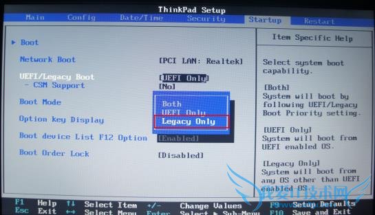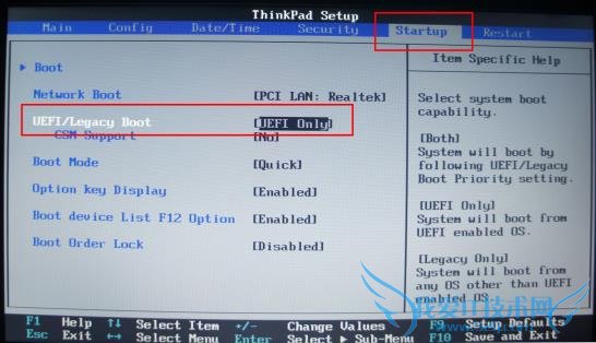 2. 按ESC键回退到主界面,在Startup标签下找到UEFI/Legacy Boot选项,把默认状态UEFI Only改成Legacy Only;