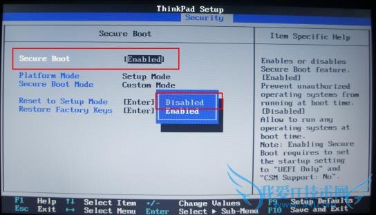 1. 在Security标签下找到Secure Boot选项,回车进入,把第一项Secure Boot从“Enabled”切换为“Disabled”;