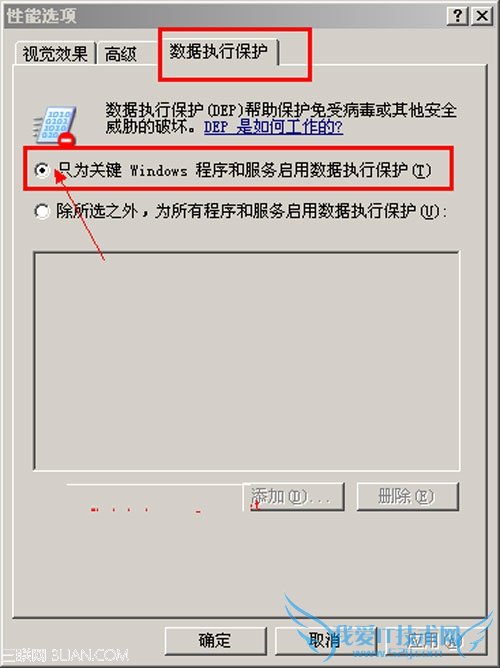 3、在出现的“性能选项”窗口中切换到“数据执行保护”选项卡,选中“只为关键Windows程序和服务启用数据执行保护”即可,相关截图如下所示: