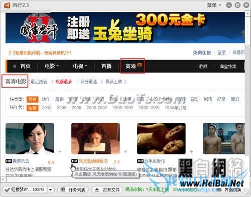 在风行2.3主窗口界面上方的导航标签中,单击“高清HD”(图5),切换到“高清电影”频道页面,这里收录了千余部不同类型、不同年代的经典 高清电影,并且每天都会被更新。只要单击自己感兴趣的电影“海报”图标,风行就会自动导入点播任务并打开播放窗口,然后就可以享受高清视觉盛宴了。