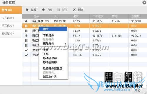 2、在这里您可以看到曾经观看过的影视节目列表,在列表中直接双击某部电影的名称,或者用鼠标右键单击该电影名称,然后选择快捷菜单中的“播 放”命令,就可以再次进行大片的视觉震撼之旅了。还可以通过任务管理工具栏进行“播放”、“下载”、“暂停”和“删除”任务等操作。