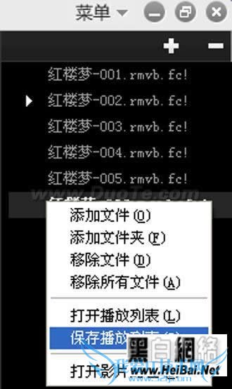 3、然后在“播放列表”中用鼠标右键单击某集电视剧的播放文件(例如“新红楼梦-005.rmvb”),接着在快捷菜单中选择“保存播放列表”命令(图2),打开“另存为”对话框,选择一个事先创建好的文件夹,将播放列表保存为“MyList.fsl”文件。